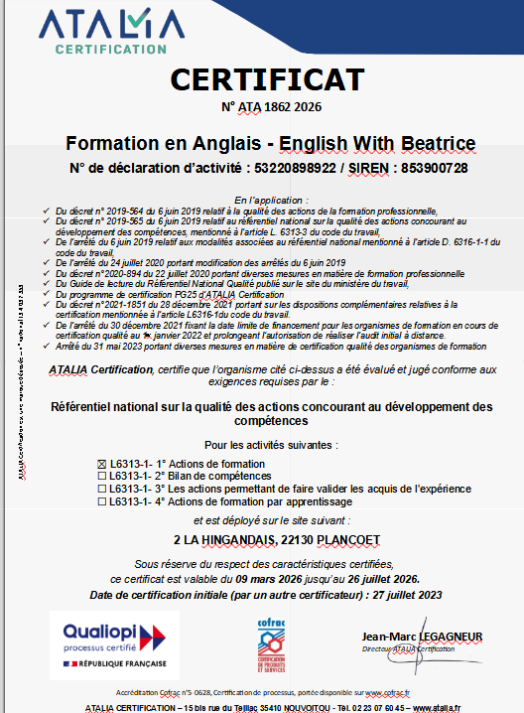 In October 2019 I decide to set up « Formation en anglais :English with Beatrice».